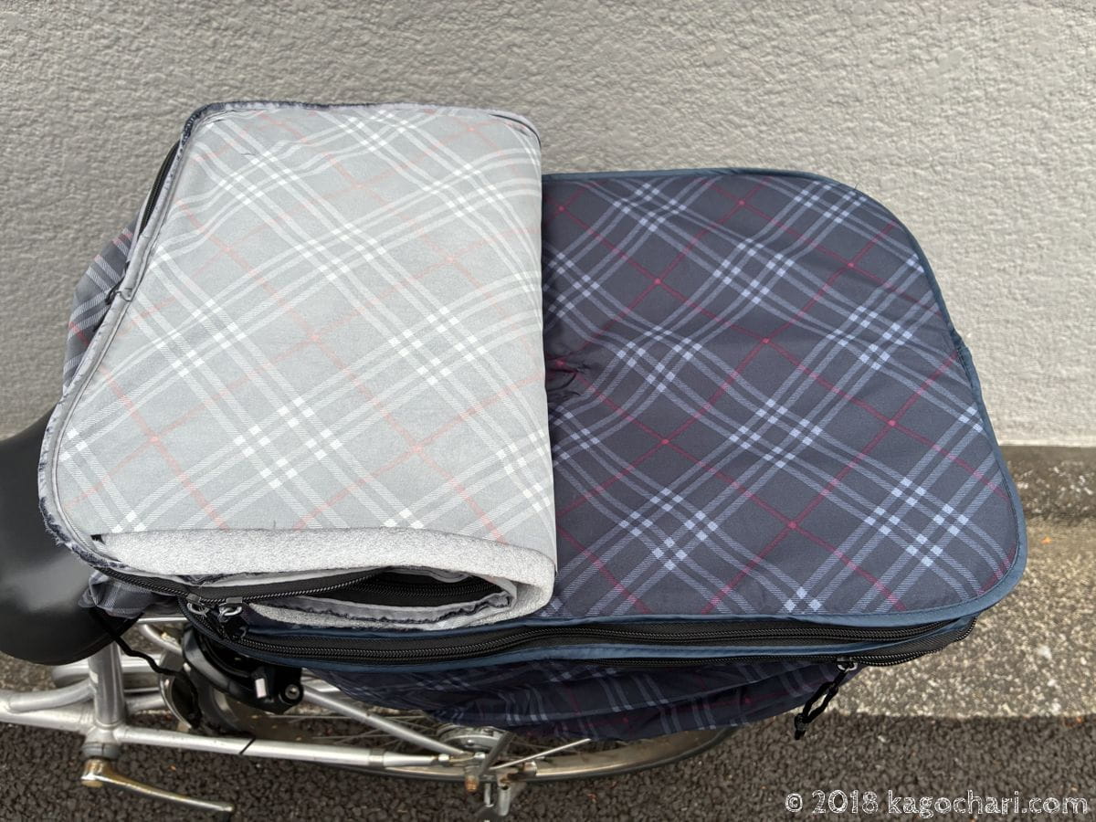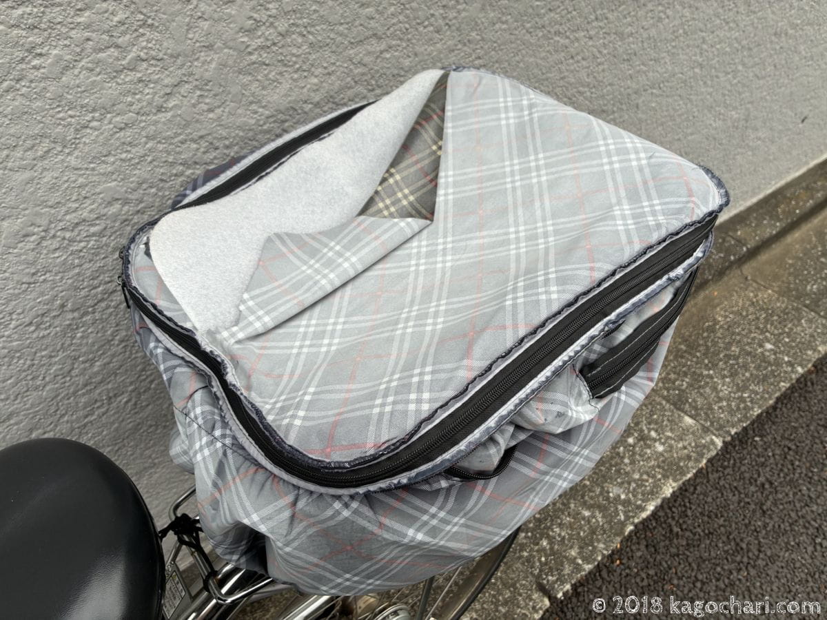 後ろカゴを覆いたい、ある程度の防水性を持たせたいと考えた時に便利なアイテムです。チャック開閉による2段構造になっているのも面白いですね。