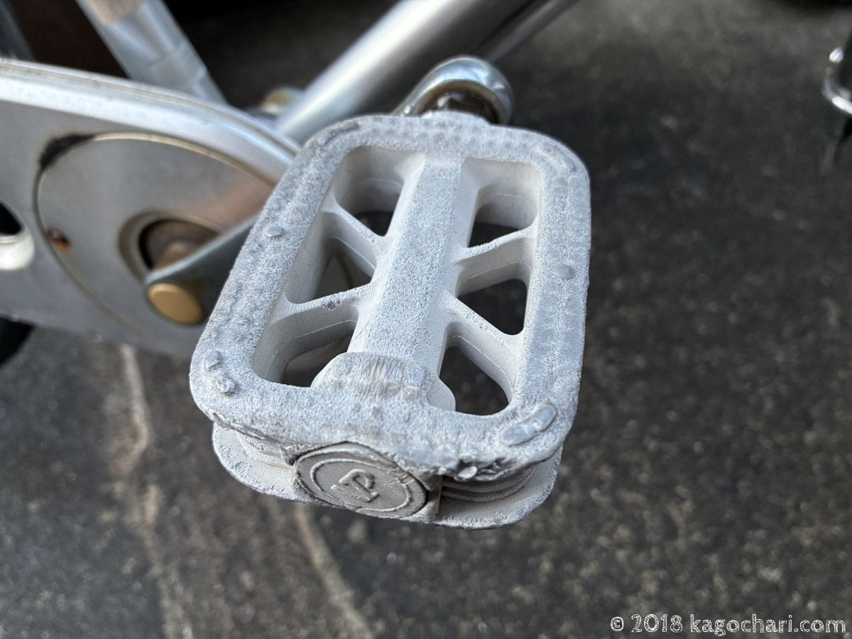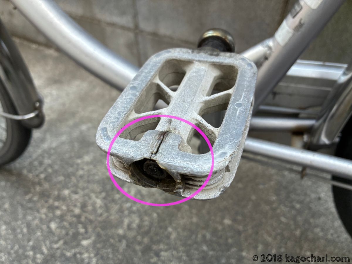 違和感があったペダルは左足側で、漕ぐたびに「パキパキ」という音がしていました。