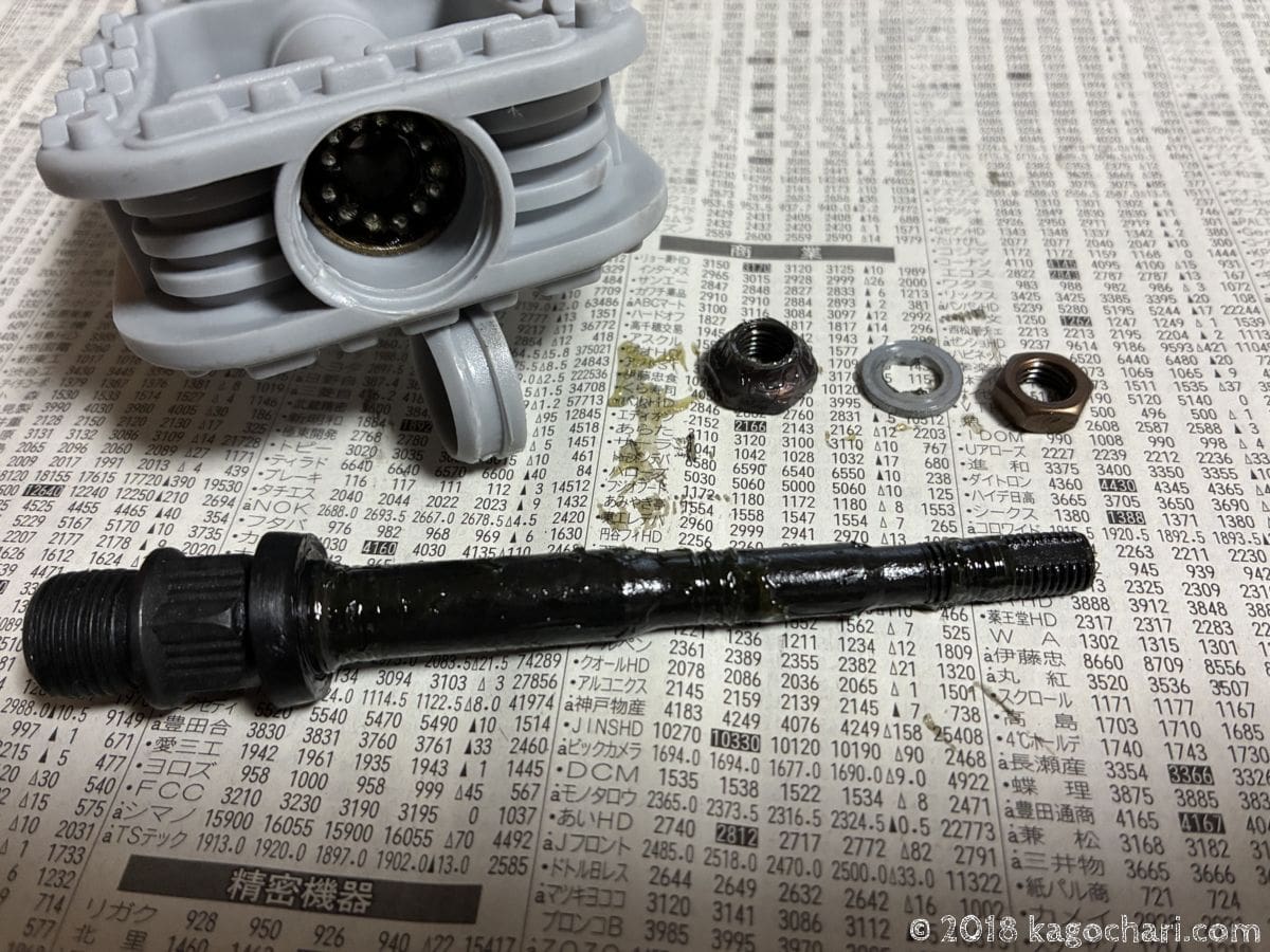 今回のペダル交換にあたって、グリスの塗り直しと玉押し調整を行いました。新品なので玉押し調整だけでもよさそうですが、どうせならと、ついついやりたくなってしまいますね。