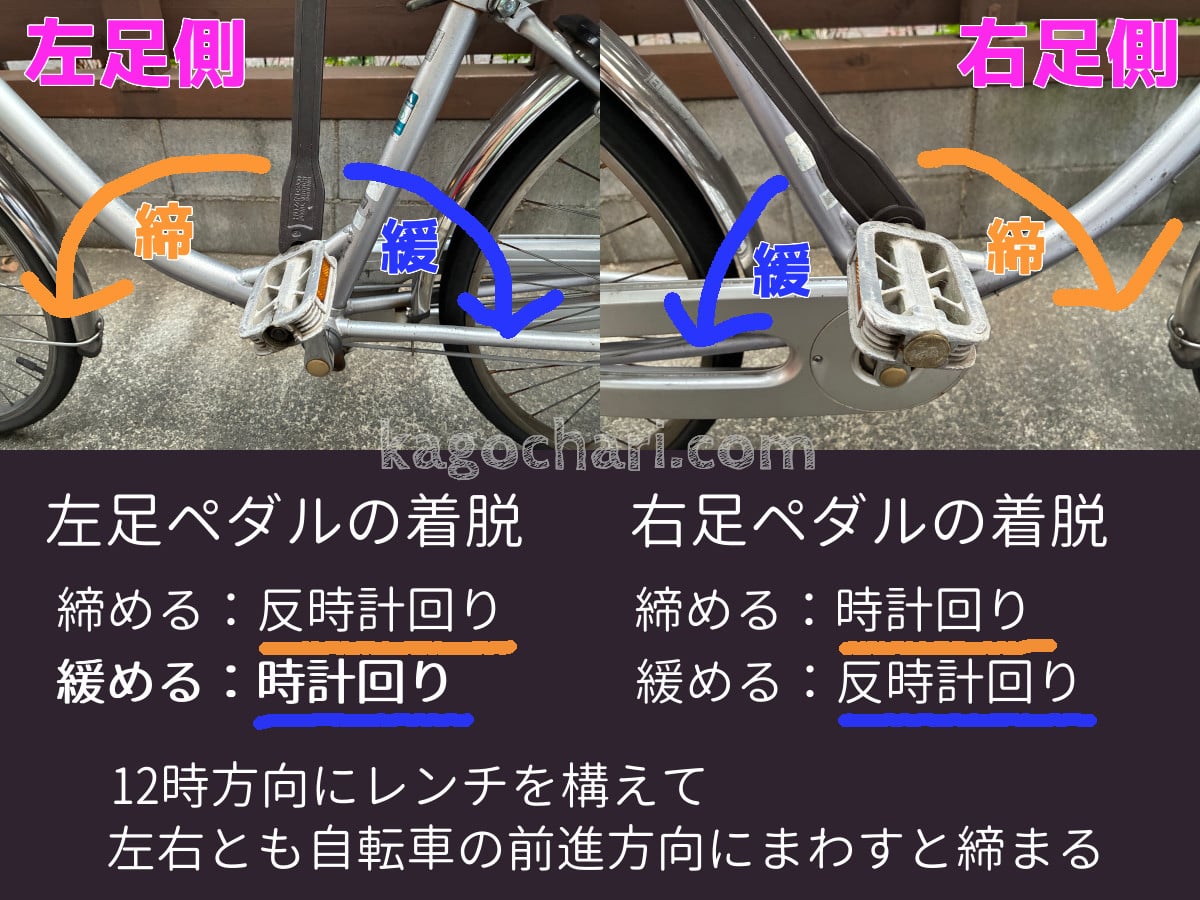 基本的に12時の方向に工具を構えて、自転車の前進方向で締まる、逆で緩まります。これは走行中にペダルが緩むことを防ぐための構造のようです。
