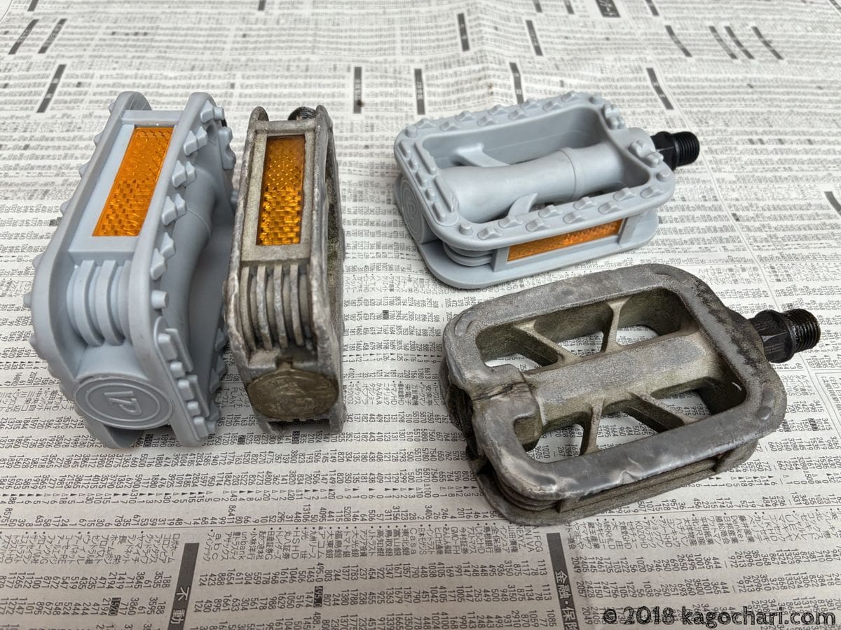 以前、プレシジョントレッキングのペダルをアルミ製に交換および、余ったものをママチャリに移植したことはあったのですが、ママチャリ用のペダルを購入することははじめての経験です。