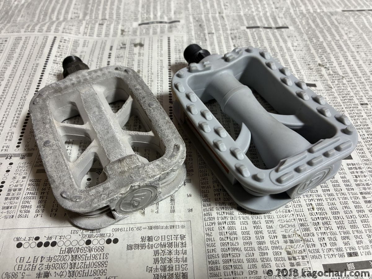 新旧ペダルの比較です。古いペダルは表面に細かなヒビが入っていたり、滑り止めが削れてしまってツルツルしています。